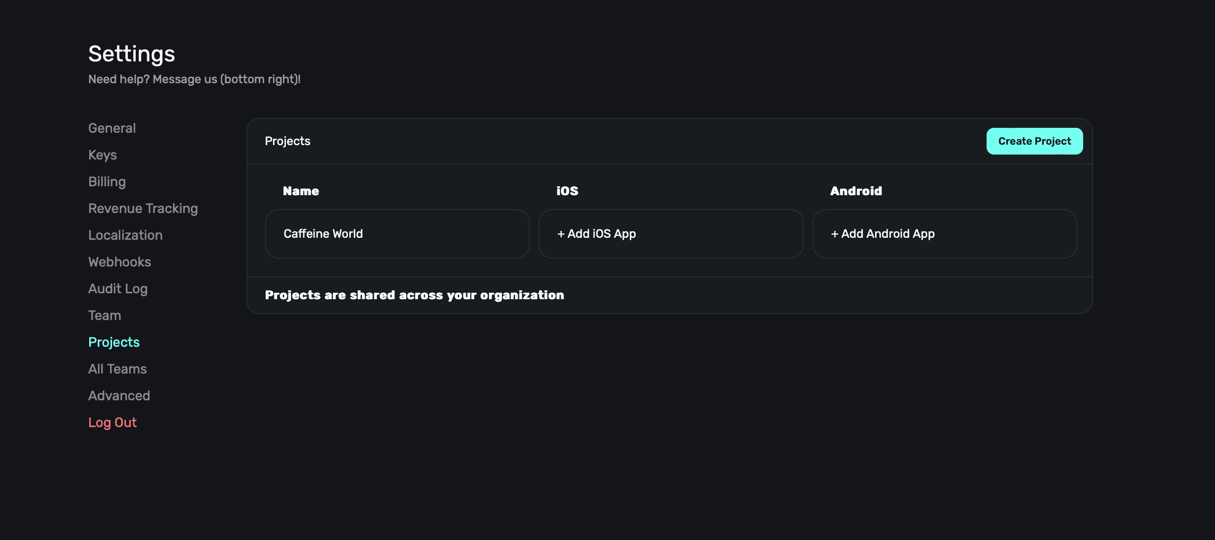 After you've created a project, you can select an app for the iOS and Android platform by clicking their respective buttons: