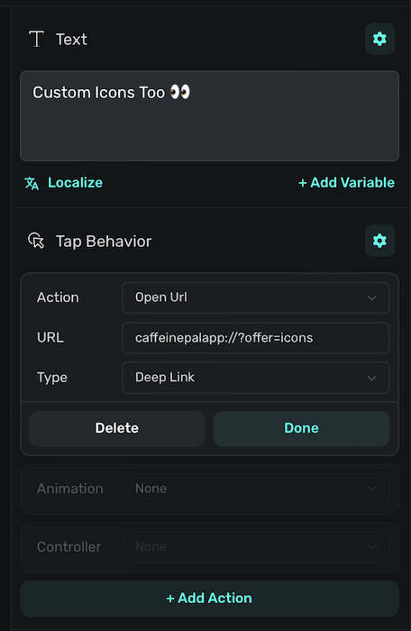 offeris the key andiconsis the value. Your resulting URL should be constructed like this:deepLinkScheme://?someKey=someValue. - Set its Type to Deep Link.