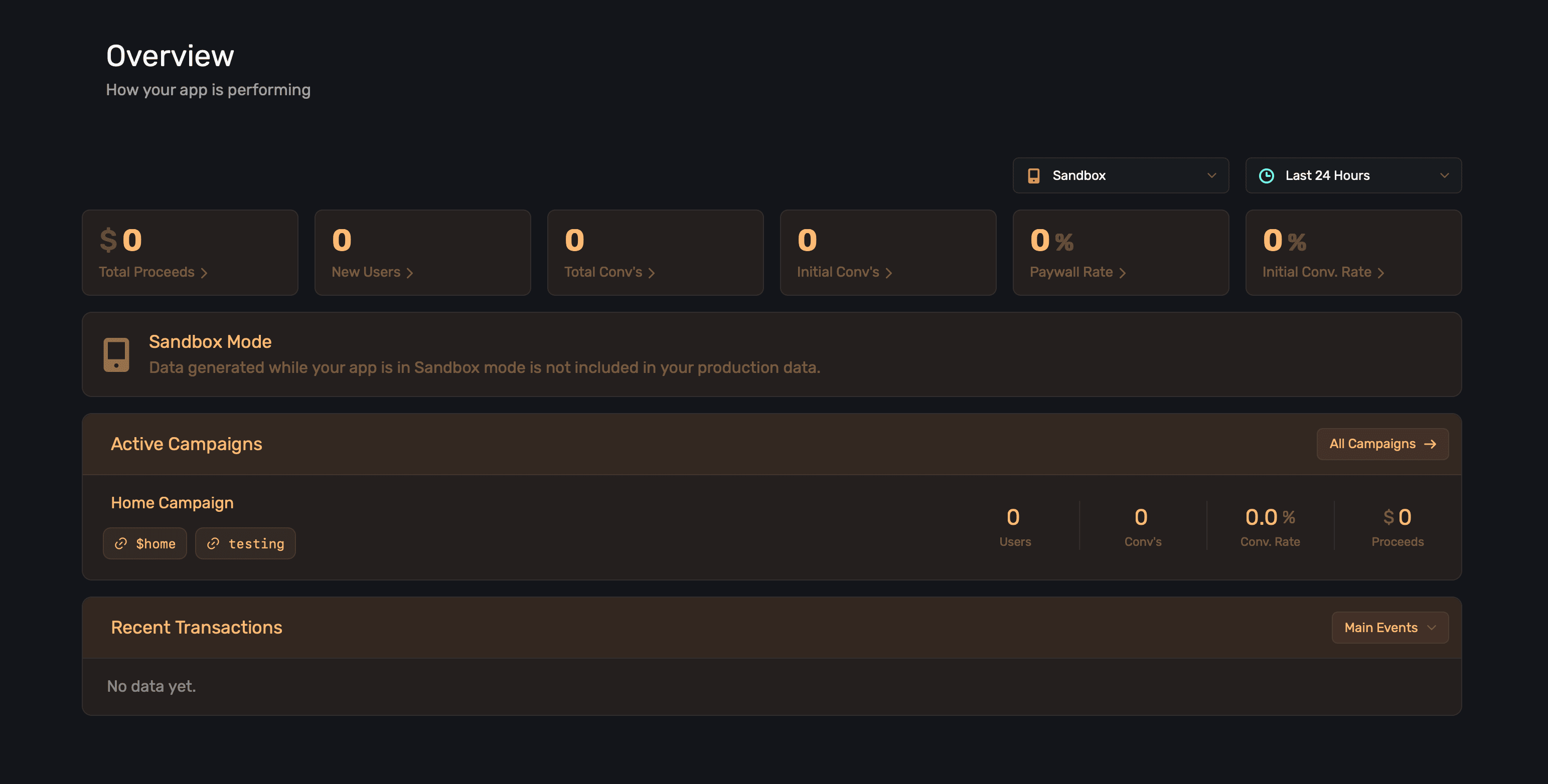When testing with sandbox products, you can see their details in the Overview page. For this to work, all products on a paywall must be test products. Put differently, the sandbox metrics won't show here if you mixed and matched live and sandbox products on the same paywall when testing: