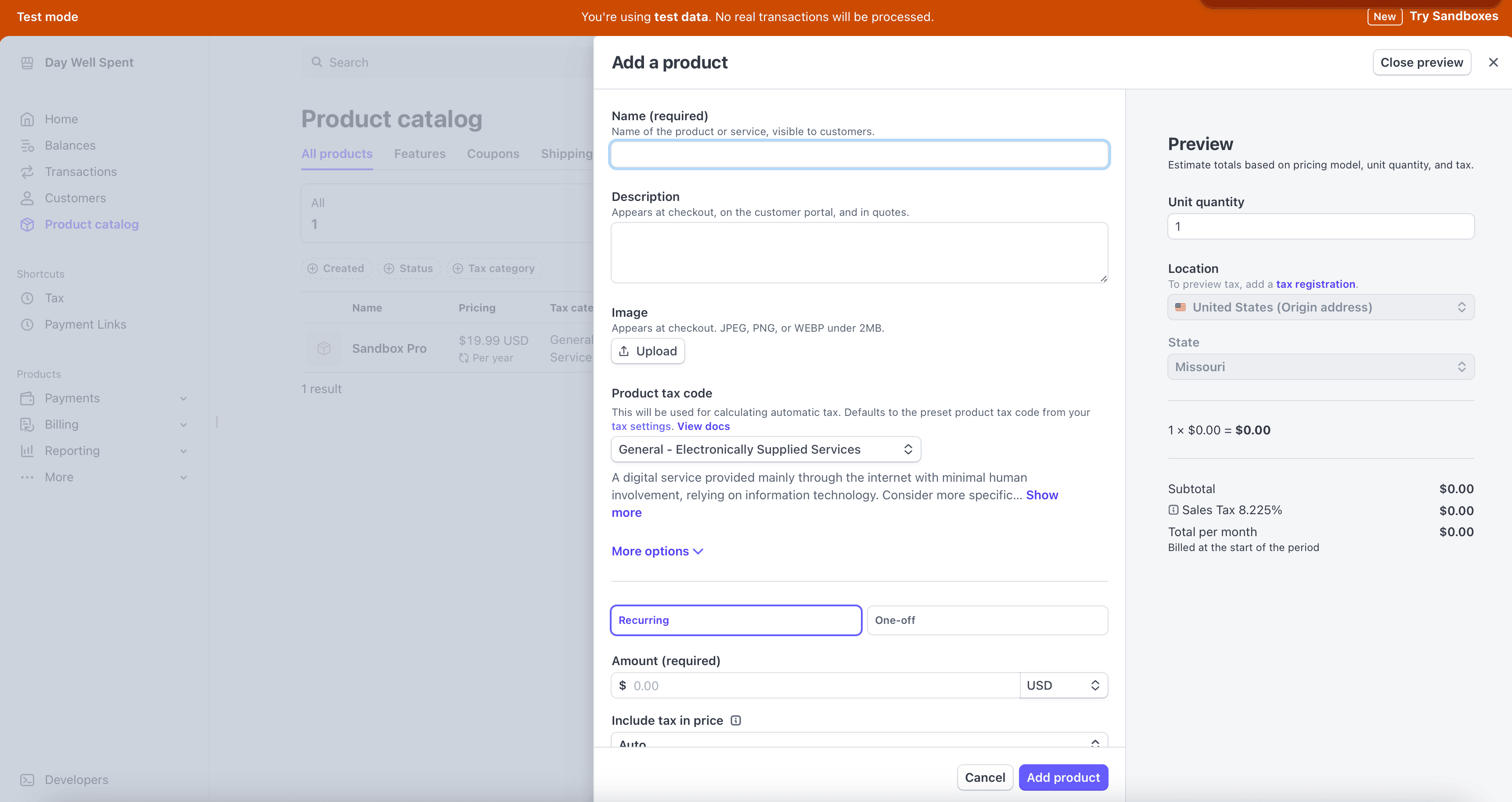 Sandbox products are used to test purchases. When you create one, you can add it to any web paywall to test check out flows. You create sandbox products the same you create other products, just choose "Sandbox Product" when creating a product. You'll see a sandbox banner at the top of Stripe when you create these types of products:
