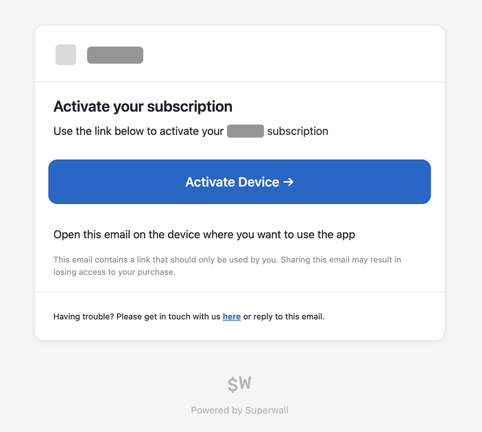 https://{your URL in settings}.superwall.app/manageBy default, after a successful checkout, Superwall emails the address used at checkout with instructions and a redemption link to activate the subscription in your iOS app. The email is sent from Your app name <support+your-app-name@superwall.app> with the subject Your activation link from your app name.